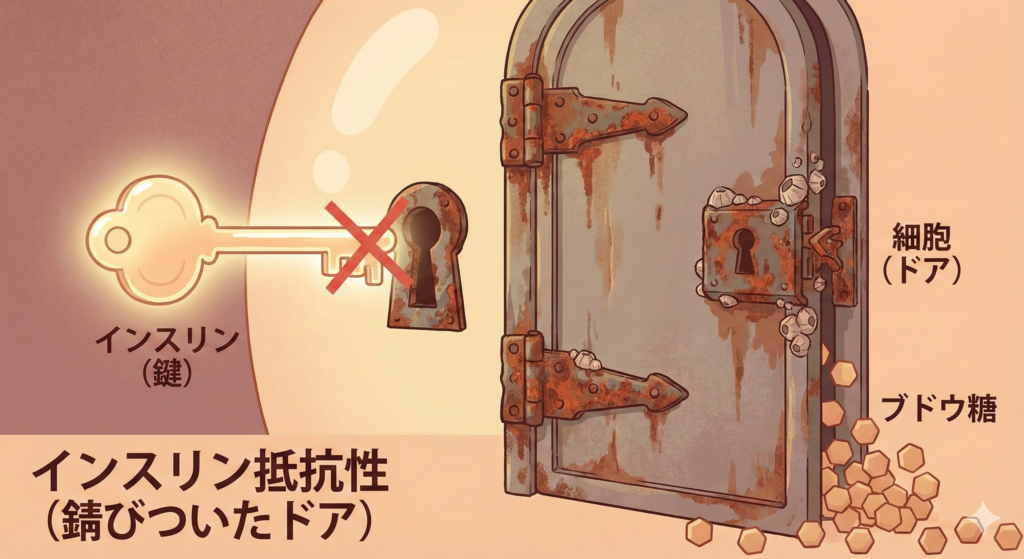 細胞を「部屋」、インスリンを「ドアを開ける鍵」に例えてみましょう。 通常、インスリンという鍵を使えば、血液中の糖分はスムーズに部屋(細胞)の中へ入っていきます。